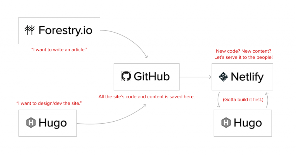 - Hugo: After our experience with Jekyll and some research about the performance differences between Hugo and Jekyll, we decided to pivot and build the site in Hugo with Forestry at the front end. (Note: Even though we’ve been relatively happy with Forestry, if I had it to do over again, I probably would have gone with Netlify CMS to reduce the complexity of our setup.)
