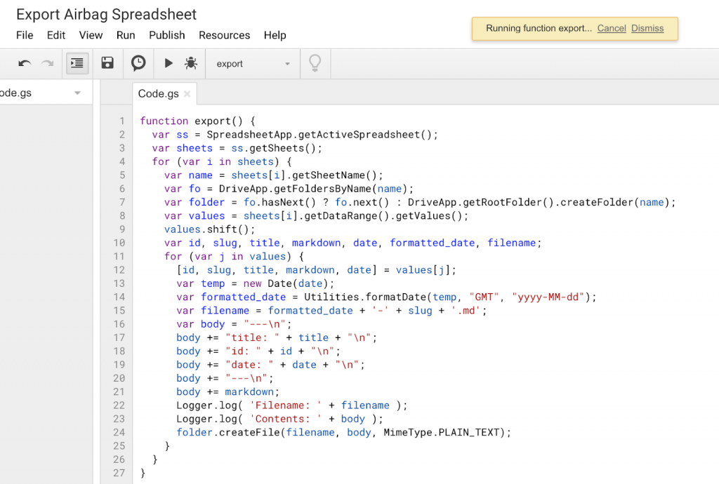 In short, it loops through all the rows in the spreadsheet and creates a file for each in my Google drive with a filename based on the date and slug and the file contents based on the spreadsheet contents.