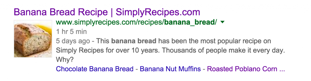One important bit of information that the Recipe schema supports is itemprop=“image”. If you include this markup on your recipe’s main photo image tag, Google will typically put this photo next to your site on search result pages (a “rich snippet”).