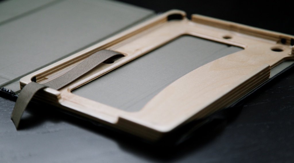 The cradle is ingeniously designed so that friction keeps the iPad snug in place without any adhesive and without covering the face of the device at all. The bookmark functions like the strip of fabric often placed beneath batteries in hard-to-reach battery compartments; give it a firm tug to pop the iPad out of the cradle. Channels are carved in the wood for the charge port, volume rocker, power button, headphone jack and cameras; there’s also a channel carved out beneath the speakers that really help carry the sound.One of my favorite features, however, is the multi-position cover. The entire case is bound like a book, which means you can fold the front cover back at the spine and it folds completely flat under the wood cradle. The cradle itself is slightly hinged, and there’s a groove pressed in the cover that the cradle can flip out and rest in. This means that you can either flip it open and read it like a notebook, or you can tip out the wooden cradle and set it up in landscape mode for reading or use beside a laptop. Lots of cases have similar functionality, but it’s really nice to have something that by all appearances looks like a book, yet manages to be so versatile.