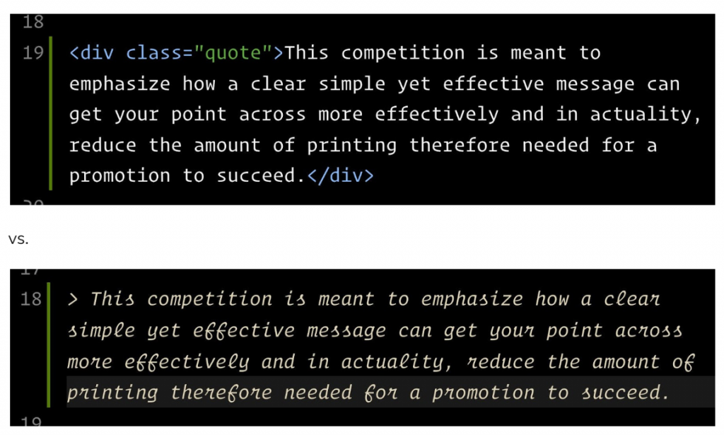 Because Greg tends to quote external articles, I also ran a few regular expressions to transform a quote class for block quotes into Markdown’s block quote syntax.