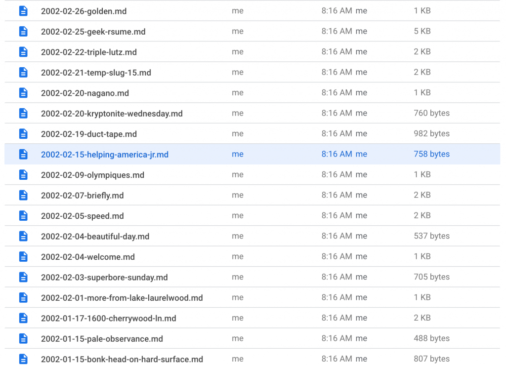 Once Greg had selected the posts he wanted to keep, I put together a script that would export the Google Sheets as individual Markdown files in my Google Drive: