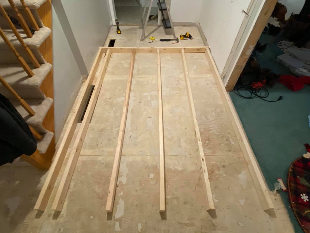 This is the wall separating the new closet and pantry. The board on the ground closest to the front door is where the front closet wall/doorway will stand. The front closet will be 24" deep, and the pantry will be about 36" deep. The wall is 72" wide, and the closet doors will be 60" wide. Since the pantry is about 3’ x 6’, I’m planning to install 12" shelving along the long back wall and 18" shelving along the short side wall.