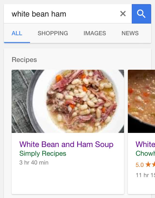 The trouble is, Google’s carousel design is really meant for horizontally-oriented photos, but most of our featured images are vertically-oriented (tall instead of wide). Practically speaking, this means that many of our images are really unhelpful when they show up in the carousel. Take, for instance, this white bean and ham soup recipe: