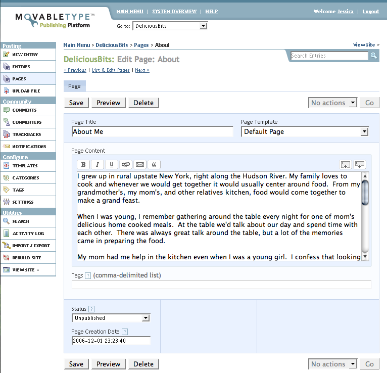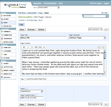 Instead of getting mixed in with Entries, another section called “Pages” would be added to the blog. It would function almost exactly like the Entries section, only it would list all of our static pages. Keeping it separate would accomplish two things: a clear distinction for both types of content in the mind of the user and no hassle with archives when rebuilding. (MT might not allow this type of functionality, so I may be deluded about this…)